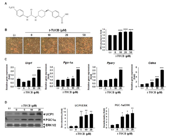 To explore the molecular mechanisms by which the sEH inhibitor promotes murine brown differentiation, the abilities of t-TUCB to activate PPARγ and PPARα were tested using the respective transactivation reporter assays. t-TUCB at 20 µM significantly activated both PPARγ and PPARα (p < 0.001 for PPARγ and p < 0.01 for PPARα, respectively) whereas t-TUCB at 5 µM only activated PPARα (p < 0.05) (Figure 6A,B). It is not known if t-TUCB acted by stabilizing EpFAs, as a PPAR agonist, or possibly both since t-TUCB was designed as a mimic of EET [25], which has been shown to have PPAR agonist activity [26].
