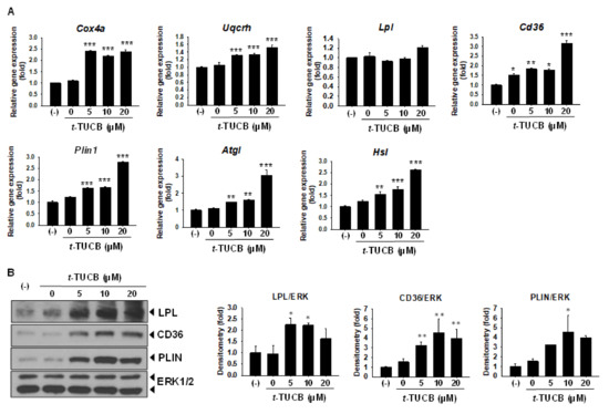 Moreover, we examined the effects of t-TUCB on mRNA expression of genes related to the brown adipocyte thermogenic function, i.e., mitochondrial respiratory chain and lipid metabolic genes. It is known when brown adipocytes are activated by cold or β adrenergic stimulation, lipid uptake and lipolysis are increased as fatty acids are not only used as fuel for oxidation but allosterically activate UCP1 [1]. t-TUCB significantly increased mRNA levels of mitochondrial cytochrome c oxidase subunit IV isoform (Cox4a, a subunit of respiratory chain Complex IV) and cytochrome b-c1 complex subunit 6 (Uqcrh, a subunit of respiratory chain Complex III) (Figure 4A). Of the two primary genes responsible for taking up fatty acids from the circulation into the brown adipocytes lipoprotein lipase (Lpl) and cluster of differentiation 36 (Cd36), t-TUCB did not change Lpl mRNA levels but significantly increased Cd36 mRNA levels (Figure 4A). t-TUCB also significantly increased mRNA levels of perilipin (Plin1), a lipid-coating protein that controls the access of lipases to the lipid droplet, and mRNA levels of adipose tissue triglyceride lipase (Atgl), and hormone-sensitive lipase (Hsl). Atgl and Hsl catalyze the removal of fatty acids from sn-1 and sn-2 position to generate diacylglycerol and monoacylglycerol, respectively. Protein expression of LPL, CD36, and PLIN were also increased by t-TUCB (Figure 4B).