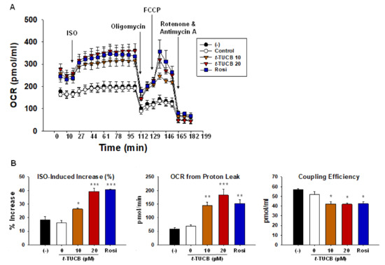 To confirm whether t-TUCB increases mitochondrial respiration in murine brown adipocytes, cellular energetics were measured using an XF24 Extracellular Flux Analyzer (Figure 5). PPARγ has been recognized as a master regulator for both white and brown adipocyte differentiation [23] and rosiglitazone (Rosi), a synthetic ligand for PPARγ, was shown to promote brown adipocyte differentiation [24]; therefore, we included Rosi as a positive control in our assays. t-TUCB or Rosi-treated brown adipocytes had a higher basal oxygen consumption rate (OCR) compared to the controls (Figure 5A). Isoproterenol (ISO), a non-selective β adrenoreceptor agonist, significantly increased OCR in Rosi-treated cells (p < 0.001), compared to the controls (Figure 5B Left panel). ISO significantly increased OCR in the cells treated with t-TUCB at 10 and 20 µM (p < 0.05 and p < 0.001, respectively) (Figure 5B Left panel). Similar to Rosi, t-TUCB treated cells also had higher OCR produced by proton leak (i.e., mitochondrial uncoupling) (p < 0.01 and p < 0.001 for t-TUCB at 10 and 20 µM; p < 0.01 for Rosi) (Figure 5B Middle panel) and lower coupling efficiency (i.e., percentage of OCR for ATP production) (p < 0.05 for t-TUCB at 10 and 20 µM and for Rosi) (Figure 5B Right panel). In addition, t-TUCB treated cells had significantly higher OCR for ATP synthesis (p < 0.05 by t-TUCB at 20 µM) and no significant changes in maximal respiration compared to the controls (Supplemental Figure S2).