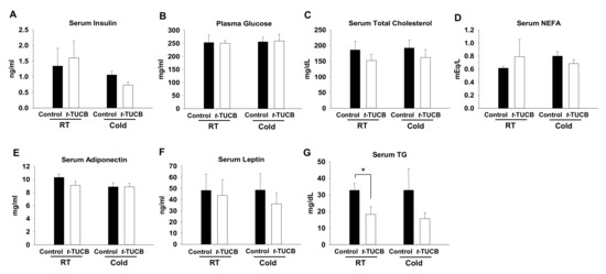 t-TUCB delivered via mini osmotic pump decreases serum triglycerides in diet-induced obese mice. C57BL6/J mice were fed a high-fat diet for 8 weeks, followed by t-TUCB (3 mg/kg/day) or the vehicle containing osmotic minipump implantation for 6 weeks as described. Serum insulin (A), plasma glucose (B), serum total cholesterol (C), NEFA (D), adiponectin (E), leptin (F), and TG (G) levels in the control and t-TUCB treated mice in the RT and cold condition. Data = Mean + SEM (n = 4–). *, p < 0.05 compared to the controls, respectively.