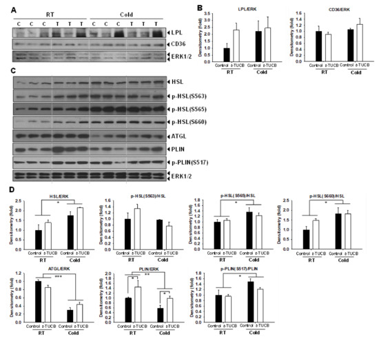 t-TUCB delivered via mini osmotic pump increases protein expression of genes involved in lipid metabolism in the interscapular brown adipose tissue of diet-induced obese mice. (A,B) Protein expression of LPL, CD36, and the loading control ERK in the iBAT of t-TUCB treated and the control mice, and their densitometry. (C,D) Protein expression of HSL, ATGL, PLIN, the phosphorylation of HSL and PLIN, and the loading control ERK in the iBAT of t-TUCB treated or the control mice, and their densitometry. Bar graphs show normalized densitometry for LPL/ERK1/2 and CD36/ERK1/2 in (B) HSL/ERK1/2, ATGL/ERK1/2, PLIN/ERK1/2, and p-HSL(S563)/HSL, p-HSL(S565)/HSL, p-HSL(S660)/HSL and p-PLIN(S517)/PLIN in (D). Data = Mean+SEM (n = 3). *, **, ***, p < 0.05, p < 0.01, and p < 0.001 compared to the controls, respectively.