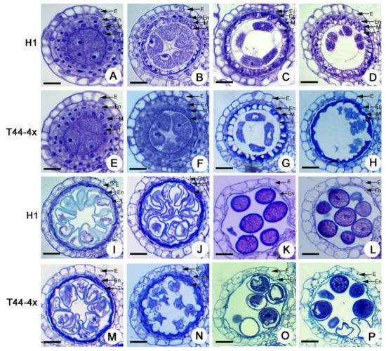 In H1, a four-layer anther wall (from the outside to the inside: epidermis, endothecium layer, middle layer, and tapetum) was generated at the pollen mother cell formation stage (Figure 2A). No obvious defects were found between the H1 and T44-4x anthers in the formation of PMCs (Figure 2B,F). During pollen mother cell (PMC) meiosis, the PMCs underwent meiosis, and normally formed dyads with cell plates in H1 and T44-4x were clearly observed (Figure 2C,G). Subsequently, dyads and tetrads also formed in H1 and T44-4x, and no obvious abnormalities were found in this stage (Figure 2D,H). Thereafter, the microspores of H1 underwent vacuolation and mitosis to form mature pollen with spherical or elliptical shapes (Figure 2I–L). In contrast, the microspores of T44-4x degraded further after the late microspore stage (Figure 2M,N), with typical abortion at the mature pollen stage, which resulted in abortive pollens (Figure 2O,P). All these results suggest that H1 caused slight defects in the microspores compared with T44-4x during the pollen development process.