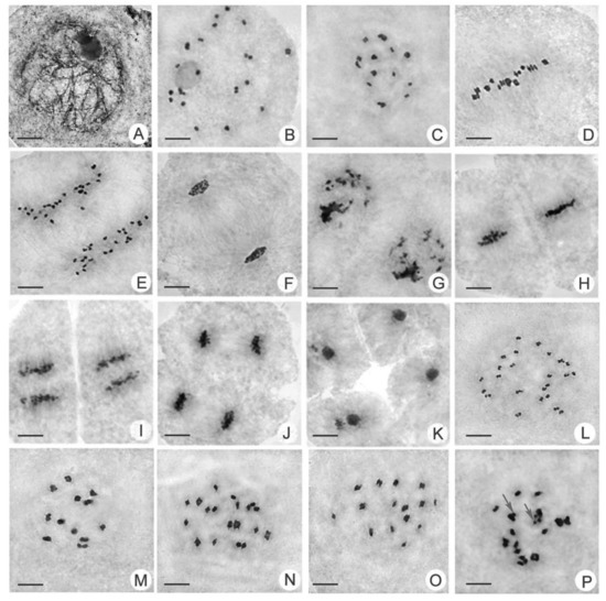 - He, J.H.; Shahid, M.Q.; Chen, Z.X.; Chen, X.A.; Liu, X.D.; Lu, Y.G. Abnormal PMC microtubule distribution pattern and chromosome behavior resulted in low pollen fertility of an intersubspecific autotetraploid rice hybrid. Plant Syst. Evol. 2011, 291, 257–265. [Google Scholar] [CrossRef]
