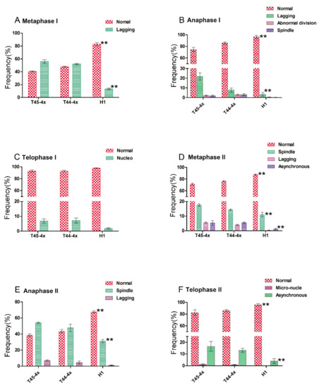 H1 showed a lower percentage of abnormal PMCs compared with its two parents (Figure 4). In this study, the percentages of abnormal cells in H1 were 19.48%, 1.61%, 1.80%, 13.64%, 34.29%, and 1.94% in Metaphase I, Anaphase I, Telophase I, Metaphase II, Anaphase II, and Telophase II, respectively (Tables S3 and S4). In contrast, the autotetraploid rice parents of T45-4x and T44-4x showed many more abnormalities than H1 (Figure 4). For example, the percentages of abnormal cells in T44-4x were 52.14, 15.05, 3.96, 23.10, 52.14, and 12.12% in Metaphase I, Anaphase I, Telophase I, Metaphase II, Anaphase II, and Telophase II, respectively (Tables S3 and S4).