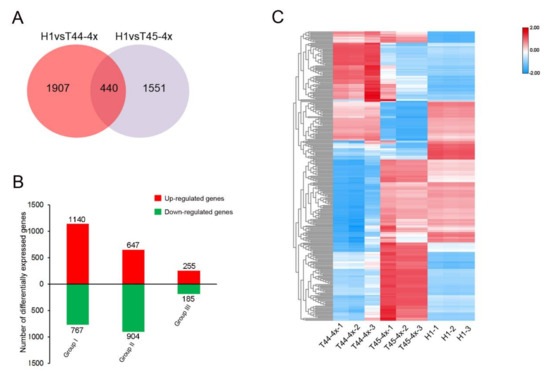 Differentially expressed genes in meiotic anthers of H1 detected by RNA-sequencing analysis compared to its two parents. (A) Venn diagram of differentially expressed genes in H1 detected by RNA-sequencing analysis. (B) Number of differentially expressed genes in H1 compared to its parents. Group I refers to the DEGs of H1 derived from T44-4x; Group II refers to the DEGs of H1 derived from the T45-4x; Group III refers to differentially expressed genes in H1 and its two parents. (C) Expression patterns of common DEGs in H1 and its two parents. Red and blue colors indicate differentially expressed genes that were up- and down-regulated, respectively.