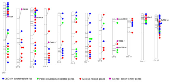 Autotetraploid rice is a useful germplasm derived from diploid rice by chromosome doubling. In comparison with corresponding rice, stronger biological vigor and heterosis were found in autotetraploid rice [7,8,9]; however, low pollen fertility is a major hindrance for its utilization [10,11]. Pollen abnormalities appear to be the major obstacles for a normal seed set [8,10]. Several previous studies have focused on the causes of low pollen fertility in autotetraploid rice, and the results were mainly focused on the abnormal pollen development process [10,12,13,14,15,16,17]. Abnormal chromosome behavior during meiosis and the down-regulation of pollen fertility genes were the primary causes of pollen sterility in autotetraploid rice. Therefore, it is critical to reveal the reasons for low pollen fertility and to acquire high-pollen-fertility tetraploid materials.