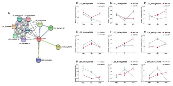 To further investigate if the knockout line regulated the pollen development process of H1, we used nt-tms5-1 for further analysis (Figure 8A). From this study, nine genes were selected to analyze their gene expression levels in nt-tms5-1 and its wild type (Figure 8B–J). We conducted qRT-PCR analysis to detect the nine transcripts of these genes in nt-tms5-1 and the wild type (Figure 8). In this study, the expression levels of the nine genes were shown to be differentially expressed between nt-tms5-1 and the wild type. For example, four genes, LOC_Os04g50600, LOC_Os04g32930, LOC_Os03g40110, and LOC_Os04g59600, were down-regulated in the meiosis stage in nt-tms5-1 compared to their levels in the wild type. Five genes—LOC_Os06g43690, LOC_Os03g13160, LOC_Os03g05720, LOC_Os09g30486, and LOC_Os04g46310—were up-regulated in meiosis in nt-tms5-1 compared to the wild type. These results verify that TMS5 interacted with other genes and knockout of TMS5 could also cause down-regulation of other genes in H1.