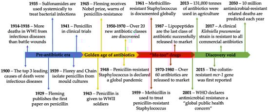 Prior to the commercialization of antibiotics, the three leading causes of death were pneumonia and flu, tuberculosis, and gastrointestinal infections [3]. During World War I (WWI), infectious diseases caused more deaths than battle wounds [4]. The serendipitous discovery of penicillin in 1928 marked a new era of modern medicine [5]. Not only did it spark the development of new antibiotics, but it changed the entire drug discovery pipeline. Today, we have a myriad of antibiotics that are effective against a wide range of bacteria. However, the over-reliance on antibiotics came with a cost—a cost we were warned about by Alexander Fleming in his 1945 Nobel prize acceptance speech. He expressed his concern about improper use of penicillin and how easily resistance is acquired with insufficient treatment dosages [6]. It is clear we did not heed this warning and are now suffering the consequences. A brief timeline of antibiotic resistance is provided in Figure 1.