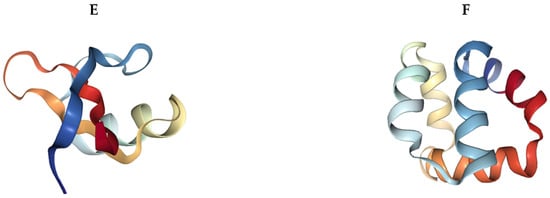 Three-dimensional conformations of natural antimicrobial peptides. Sourced from the Protein Data Bank (https://www.rscb.org). (A) LL-37 (Homo sapiens) [26]. (B) Magainin-2 (Xenopus laevis) [27]. (C) RTD-1 (Rhesus macaque) [28]. (D) Melittin (Apis mellifera) [29]. (E) TPP3 (Solanum lycopersicum) [30]. (F) Bacteriocin AS-48 (Enterococcus faecalis) [31].