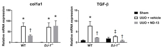In order to characterize the role of DJ-1 in the development of the renal fibrosis associated with UUO, we performed similar studies using the DJ-1 global knockout (DJ-1−/−) mouse. In response to UUO, and similar to our findings in the WT mice, DJ-1−/− mice significantly upregulated the mRNA expression of the marker of fibrosis Col1a1 compared to the levels that the sham group presented (Figure 1). However, and contrary to the results found in WT mice, treatment of DJ-1−/− mice with ND-13 failed to prevent the elevation of Col1a1 in the cortex after UUO. In contrast, the cortical levels of TGF-β after UUO did not significantly increase in the DJ-1−/− mice compared to sham controls, but interestingly, treatment with ND-13 was efficient in decreasing the mRNA expression of TGF-β in the renal cortex (Figure 1).