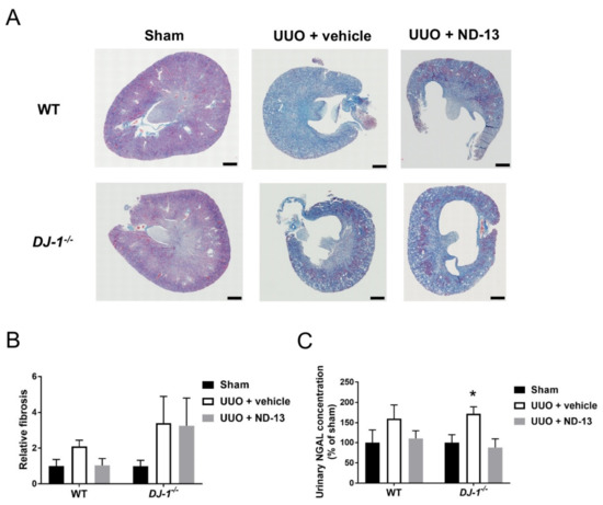 Treatment with ND-13 reduces UUO-induced renal fibrosis in WT mice. (A) Representative full scan images of Masson’s blue trichrome-stained kidneys obtained from WT and DJ-1−/− mice that underwent sham surgery, UUO and vehicle treatment or UUO and ND-13 treatment (scale bar = 500 μm). (B) Quantification of collagen deposition in renal cortex of WT and DJ-1−/− mice that underwent sham surgery, UUO and vehicle treatment or UUO and ND-13 treatment. (C) Urinary concentration of the proximal tubule marker NGAL in WT and DJ-1−/− mice that underwent sham surgery, UUO and vehicle treatment or UUO and ND-13 treatment. n = 4–5/group; * p < 0.05 vs. same genotype sham, two-way ANOVA with Tukey’s post hoc test.