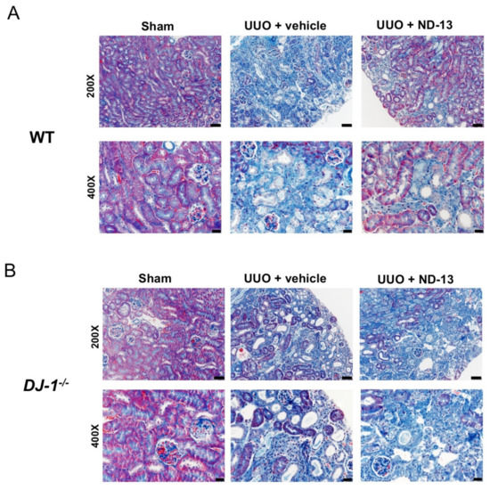 Likewise, histological evaluation of cortical tissue obtained from DJ-1−/− mice after the UUO protocol supported the molecular findings in this genotype, as ND-13 treatment had no effect on the amount of collagen deposition detected by trichrome blue staining in this region of the kidney (relative fibrosis, UUO + vehicle vs. UUO + ND-13: 3.4 ± 1.5 vs. 3.3 ± 1.5; Figure 2A,B and Figure 3B). The renal fibrosis in DJ-1−/− mice was found to be evenly distributed across the cortical region (Figure 3B).