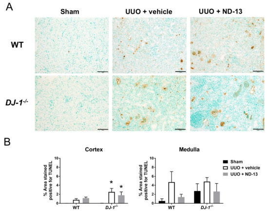 To determine if treatment with ND-13 effectively protected against kidney cell death in response to the UUO protocol, the presence of Terminal Deoxynucleotidyl Transferase-Mediated dUTP Nick-End Labeling (TUNEL)-positive areas in kidney cortex and medulla was quantified in both genotypes. As shown in Figure 4A, and as expected, WT and DJ-1−/− sham animals hardly presented any TUNEL-positive cells in the kidney cortex. UUO induced cell death in mice of both genotypes treated with vehicle, although the elevation in the percentage area of the kidney that stained positive for TUNEL only reached significance in the DJ-1−/− mice, and appeared to be greater than in WT mice (p > 0.05, Figure 4B). Upon closer examination, the cortical TUNEL-positive stain was observed in glomeruli, tubular cells and interstitial cells in both genotypes. Treatment with ND-13 was unable to prevent cortical cell death in either genotype, as the percentage area of the kidney stained for TUNEL remained elevated in both. No differences between the treatments and genotypes were observed in the renal medulla (Figure 4B).