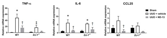 Similar to the trends found in WT mice, ND-13 had anti-inflammatory effects on DJ-1−/− mice that underwent UUO surgery, as indicated by the blunted expression of TNF-α, CCL25 and IL-6 in the renal cortex compared to the values observed in the vehicle-treated group (Figure 5). Of note, the TNF-α response to UUO was significantly smaller in DJ-1−/− mice treated with vehicle than the response observed in WT mice treated with vehicle (Figure 5).
