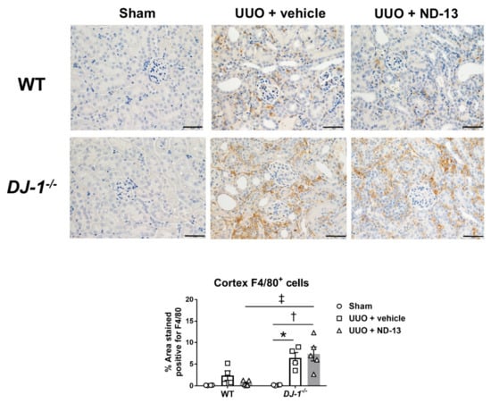 Similar to what was found with T cells, the number of macrophages infiltrating the cortex was elevated fourteen days after UUO surgery (sham vs. UUO + vehicle: 0.1 ± 0.0 vs. 2.4 ± 1.1 % area stained positive for F4/80, p > 0.05, n = 4–5/group). However, treatment with ND-13 only tended to attenuate those numbers (0.7 ± 0.3 % area stained positive; Figure 7). Evaluation of the macrophage population in the renal cortex of DJ-1−/− mice also revealed elevated numbers of these immune cells after UUO (sham vs. UUO + vehicle: 0.2 ± 0.1 vs. 6.5 ± 1.2 % area stained positive for F4/80, p < 0.05, n = 4–5/group); however, in contrast to WT mice, treatment with ND-13 failed to prevent macrophage infiltration in these mice, and the numbers of macrophages were similar to those found in mice treated with vehicle (7.0 ± 2.0 % area stained positive) (Figure 7). Of note, the magnitude of the cortical infiltration of macrophages after UUO was significantly worse in the case of the DJ-1−/− mice compared to WT mice (UUO + vehicle, WT mice vs. DJ-1−/− mice: 2.4 ± 1.1 vs. 6.5 ± 1.2 % area stained positive, p < 0.05, n = 4–5/group). Raw data for the percentage area stained positive for F4/80 quantified in each of the 10 fields/animal, as well as the mean and SEM per animal, are provided in Supplementary Table S2.