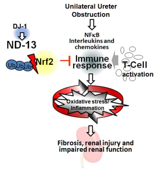 Consistent with our results, previous studies demonstrated that DJ-1 stabilized Nrf2 by preventing binding to Keap1 and Nrf2’s subsequent ubiquitination [40]. DJ-1 may amplify Nrf2 activity by avoiding its degradation. However, the ability of DJ-1 to stimulate directly the Nrf2 pathway has not been demonstrated [41]. We speculate that ND-13 prevents the undesirable consequences of chronic Nrf2 activation. Thereby, ND-13 may be an appropriate therapeutic approach to enhance the actions of Nrf2, and it could be used to minimize the side effects associated with treatment of chronic Nrf2 activation by other Nrf2 inducers i.e., bardoxolone [42,43] in humans. Our working hypothesis is that the ROS and inflammation that are induced by UUO lead to increased levels of interleukins and chemokines and, in turn, to the activation of the immune response in the kidney. This inflammatory and oxidative milieu creates a vicious cycle that leads to fibrosis and promotes kidney damage and kidney dysfunction. In this setting, DJ-1 prevents the ubiquitination of Nrf2, amplifying this molecule’s antioxidant response. We speculate that Nrf2 would attenuate oxidative stress and inflammation in the kidney, leading to reduced cytokine expression and thereby preventing inflammation and preserving renal function (Figure 8).