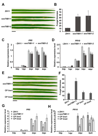 Hou, H.; Fang, J.; Liang, J.; Diao, Z.; Wang, W.; Yang, D.; Li, S.; Tang, D. OsExo70B1 Positively Regulates Disease Resistance to Magnaporthe oryzae in Rice. Int. J. Mol. Sci. 2020, 21, 7049. https://doi.org/10.3390/ijms21197049
