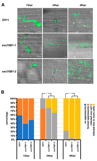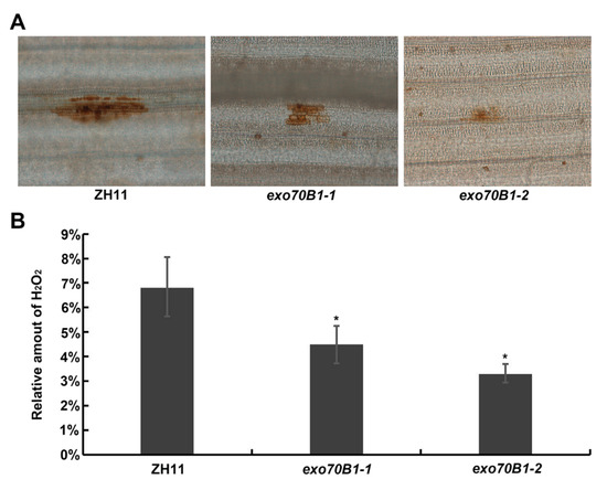2.4. Accumulation of H2O2 Is Lower and the Infection Progress Is Faster in exo70B1-1 Mutant Compared to the Wild Type