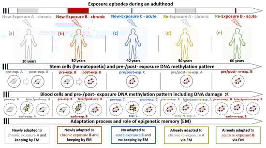 The model of the process of adaptation to environmental exposure and its “storage” by epigenetic memory in stem cells (see Section 4.1.3 for a detailed description of consequences of individual exposure episodes a–e).