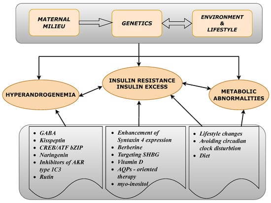 Polycystic ovary syndrome is a complex diagnostic and therapeutic problem that affects many women of reproductive age. Due to the complex etiology of this disease, all the molecular mechanisms involved in the development of the polycystic ovarian syndrome phenotype have not been fully elucidated [85,86,87]. Moreover, even the course of the illness implies the occurrence and enhancement of some symptoms (like in the case of interrelation of insulin and androgen levels), which impedes efficient treatment.