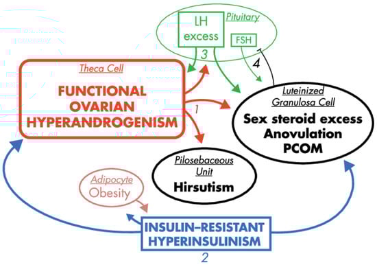 The majority of women with PCOS exhibit insulin resistance. This symptom is further exacerbated in obese PCOS patients as a result of their excess adiposity. The forthcoming consequence of the insulin resistance is hyperinsulinemia, which stems in part from excess release of insulin in the pancreas to compensate for insulin resistance. In turn, biosynthesis of sex steroids is modulated by insulin and insulin-like growth factor-1 (IGF-1), which are considered as most notable extra-ovarian factors stimulating androgen production. Both substances support ovarian and adrenal steroidogenesis (by increasing the activity of CYP type 17A1, or activating steroidogenic factor (SF-1) and its steroidogenic target genes, respectively) [42,59]. Additionally, insulin also modulates LH pulse amplitude [60], and suppresses hepatic SHBG production [61]. From this perspective, insulin resistance and hyperinsulinemia seem to be the most prominent extra-ovarian factors imposing symptoms of PCOS [62], as presented in Figure 3.
