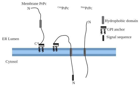 The majority of PrPc molecules are extracellularly bound to the outer leaflet of the PM via GPI anchors [25]. Moreover, there are also two transmembrane forms of PrPc, NtmPrPc and CtmPrPc, being produced in a small amount as part of PrPc normal biosynthesis (Figure 2). These two topologic isoforms are single-spanning membrane proteins with the same transmembrane domain and same hydrophobic region but different orientation in the ER membrane. NtmPrPc has the N-terminal end in the ER lumen, whereas CtmPrPc is integrated into the reverse direction displaying the N-terminus on the cytosolic side [26].