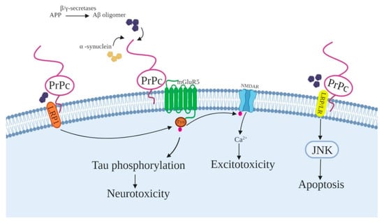 The identification of other cellular proteins that PrPc interacts with is crucial for elucidating PrPc’s physiological function in the lipid rafts compartment. Some of these interactors would probably be components of the physiological pathways in which PrPc plays a role. Interactions between PrPc and N-methyl-D-aspartate receptors (NMDARs) reduce overexcitation in neurons [146,147]. PrPc–STI1 interaction induces neuroprotective signals and rescue cells from apoptosis [148,149].