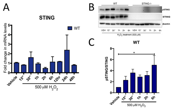 H2O2 induces an upregulation in stimulator of interferon genes (STING) expression. Increased STING expression was detected by qPCR analysis (A) (n = 4 for each time point) in WT MEF SV40 cells exposed to H2O2 treatment as compared to vehicle control. Increased phosphorylation of STING (pSTING) was confirmed at the protein level by western blot analysis (B) with a lack of STING expression identified in STING−/− cells (representative blot of n = 5 blots). Quantification of pSTING expression relative to total STING in (B) is shown in (C). All data are expressed as mean ± SEM, * p < 0.05.