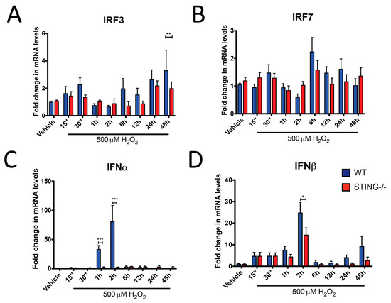 To further characterize the activation of the STING pathway following H2O2 insult, mRNA expression of IRF3, IRF7, IFNα and IFNβ were measured by qPCR analysis. Consistent with STING activation, increased IRF3 mRNA levels were identified in WT cells after H2O2 treatment, with a reduced response in STING−/− cells (Figure 3A). IRF3 was significantly reduced in STING−/− cells at 48 h of H2O2 treatment as compared to the WT cells (WT = 4.24 ± 1.22 vs. STING−/− = 1.079 ± 0.22; ** p < 0.01). In contrast, increased IRF7 mRNA expression was induced by H2O2 in both WT and STING−/− cells with no significant difference between these two genotypes (Figure 3B). These results suggest H2O2-induced IRF3 expression is STING-mediated while IRF7 can be activated independent of STING after H2O2 treatment. A robust upregulation in IFNα and IFNβ levels was identified in WT cells but reduced in the STING−/− cells at early time points (15 min–6 h) of H2O2 treatment. Peak activation of IFNα was detected at 1 h (WT = 43.32 ± 6.40 vs. STING−/− = 3.953 ± 1.53; *** p < 0.001) and 2 h (WT = 90.23 ± 18.17 vs. STING−/− = 5.65 ± 1.79; *** p < 0.001) in WT cells, with this upregulation reduced in the STING−/− cells (Figure 3C). Similarly, IFNβ levels were significantly increased in WT cells at 2 h (WT = 24.92 ± 4.85 vs. STING−/− = 14.66 ± 3.13; * p < 0.05) compared to STING−/− cells following H2O2 treatment (Figure 3D).