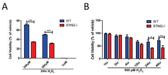 Genetic deletion of STING is detrimental to cellular survival following H2O2 treatment. MTT assay identified reduced cellular viability in STING−/− cells as compared to WT cells following (A) dose-dependent H2O2 concentrations for 24 h, (B) a time-course of 500μM H2O2 concentration (n = 4). Data represent mean ± SEM, * p < 0.05, ** p < 0.01, *** p < 0.001.