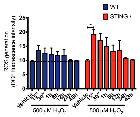Generation of intracellular ROS following H2O2 treatment is known to contribute to oxidative stress [36,37,38]. To confirm that H2O2 treatment leads to ROS generation and to further understand the modulation of the H2O2-induced oxidative stress by STING in this study, intracellular ROS levels in H2O2 treated WT and STING−/− cells were measured by a 2′, 7′-dichlorofluorescin (DCF) assay. Increased ROS levels were confirmed in both WT and STING−/− cells after H2O2 treatment as compared to the untreated control group. Importantly, STING-/cells exhibited higher ROS levels as compared to the WT cells with a rapid burst of intracellular ROS production detected at 15 min (WT = 13.55 ± 1.67; n.s. p = 0.9666 and STING−/− = 19.23 ± 0.32; * p < 0.05) that gradually decreased over H2O2 treatment (Figure 5). This suggests a role for STING as an inhibitor of H2O2-induced oxidative stress. Further, we confirmed increased ROS generation induced by H2O2 indicative of elevated oxidative stress in this in vitro model of inflammation.