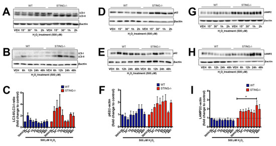 STING−/− cells display increased accumulation of autophagy markers following H2O2 treatment. WT and STING−/− cells were treated with 500 μM H2O2 for 15 min to 2 h (A,D,G) and 6 h to 24 h (B,E,H), and LC3, p62 and LAMP2 protein expression was analyzed by Western blot analysis (representative blot of n = 4 blots). LC3-I, LC3-II, p62 and LAMP2 levels were normalized to β-actin levels (C,F,I). For densitometry calculations, the LC3-II/LC3-I ratio was then determined from these values and was calculated as a fold change relative to the vehicle control as shown in (C). Data are expressed as mean ± SEM. (“) = min. * p < 0.05.