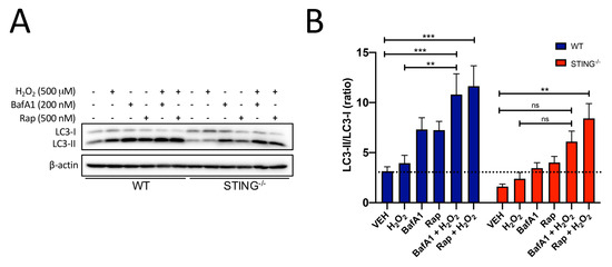 Interestingly, the addition of an autophagy inducer, rapamycin (Rap), and H2O2 in STING−/− (STING−/− LC3-II/LC3-I ratio of VEH = 1.610 ± 0.256 vs. Rap ± H2O2 = 8.417 ± 1.479; ** p < 0.01) cells induced further accumulation of LC3-II levels which was similar to that observed in WT (WT LC3-II/LC3-I ratio of VEH = 3.138 ± 0.452 vs. Rap ± H2O2 = 11.63 ± 2.042; *** p < 0.001) cells, supporting a role for STING in mediating the autophagosome–lysosomal degradation step of autophagy. The reduced cellular viability observed in the H2O2-treated STING−/− cells as compared to the WT cells can be attributed to the reduced protective effects of normal autophagy activity. Taken together, these results confirmed that autophagy is activated in response to H2O2 and identified STING as a critical mediator of efficient autophagy flux in this cellular stress context.