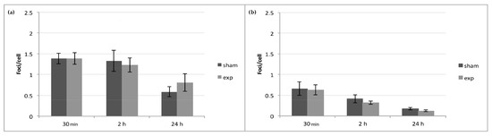 The analysis of colocalized γ-H2AX/53BP1 foci showed no significant differences (p > 0.05) between exposed and sham samples (exposed 2 h vs. sham 2 h; exposed 24 h vs. sham 24 h) for both types of signals (CW or PW) (Figure 1).