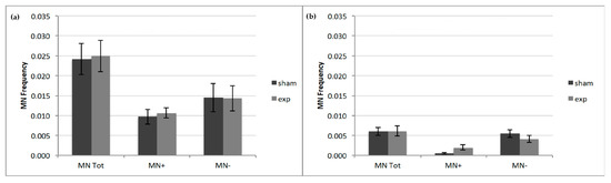 For both CW and PW signals, CREST analysis on exposed samples, with respect to the sham samples, showed no significant increase in the total number of MN, corresponding to the sum of CREST positive (MN+) and CREST negative (MN−) micronuclei. Similarly, no significant increase was observed in the frequency of MN+ and MN− in the exposed samples (CW or PW), with respect to the sham samples (Figure 2).
