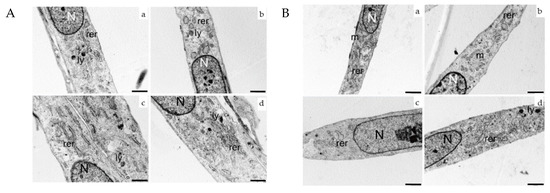 Ultrastructural analysis of HDF cells exposed to 2.45 GHz. (Panel A): sham (a,c) and 2.45 GHz CW- (b,d) exposed HDF. Exposed cells were examined 2 h (b) and 24 h (d) after exposure. Nucleus (N), rough endoplasmic reticulum (rer), lysosome (ly), mitochondria (m) (bars correspond to 1 µm). No morphological differences were found between sham or exposed cells. (Panel B): sham (a,c) and 2.45 GHz PW- (b,d) exposed HDF. Exposed cells were examined 2 h (b) and 24 h (d) after exposure. (Bars correspond to 1 µm). No morphological differences were found between sham and exposed cells.