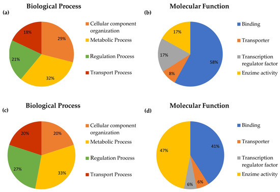Percentage of differential gene expressions (DGEs) involved in the different biological processes and molecular functions, as reported in gene ontology (GO) term analysis, for both types of signals evaluated. (a) Percentage of genes involved in each biological process after exposure to 2.45 GHz CW. (b) Percentage of genes involved in each molecular function after exposure to 2.45 GHz CW. (c) Percentage of genes involved in each biological process after exposure to 2.45 GHz PW. (d) Percentage of genes involved in each molecular function after exposure to 2.45 GHz PW.