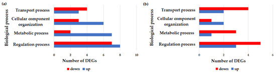 For the samples exposed to 2.45 GHz CW, the modulated genes results, mainly involved in metabolic and cellular component organization (Figure 4a) and their most relevant molecular function, were related to binding activities (Figure 4b). No significantly-affected signaling transduction pathways were identified. The results obtained for the genes differentially expressed after exposure to 2.45 GHz PW indicated that the most relevant biological processes in which they were involved were related to metabolic or regulation processes (Figure 4c), with many of them having binding or catalytic activity (Figure 4d). Even for this type of exposure, no significantly-affected signaling transduction pathways were identified. Additional information about the up- and down-regulated genes within each functional network for the two type of signals are reported in Figure 5.