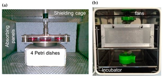 Picture of the WPC with the four Petri dishes inside. (a) WPC placed into the shielding cage with the lateral walls covered with absorbing panels. (b) Shielding cage inside the incubator with the two fans used to induce a forced air flow for temperature control.