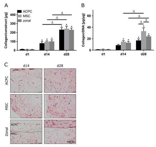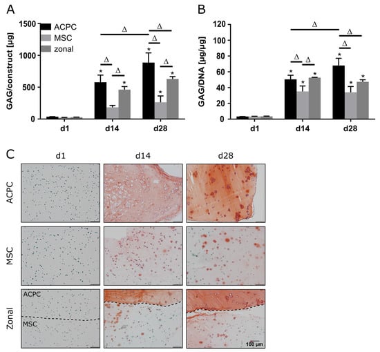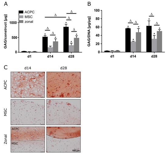 Glycosaminoglycan (GAG) production in articular cartilage progenitor cell (ACPC), mesenchymal stromal cell (MSC), and zonal constructs under normoxic conditions. Biochemical and histological analysis of GAG in agarose hydrogel constructs, seeded with 20.0 × 106 cells mL−1, after 1, 14, and 28 days of chondrogenic differentiation under normoxic conditions. ACPCs and MSCs were either cultured alone or in zonally layered co-culture constructs. (A) Production of total GAG (GAG/construct) and (B) GAG normalized to DNA (GAG/DNA). Data are presented as means ± standard deviations (n = 3 biological replicates). Note: (*) indicates statistically significant differences between a day 14 (d14) or day 28 (d28) value and the corresponding day 1 (d1) value of the same group (p < 0.05); (Δ) indicates statistically significant differences between groups, or within a group between time points (p < 0.05). (C) Histological safranin-O staining for visualization of produced GAG. In zonal constructs, the upper layer contained ACPCs and the lower layer contained MSCs (indicated by the dashed line).