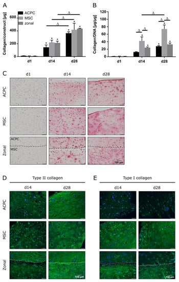 Collagen production in ACPC, MSC, and zonal constructs under normoxic conditions. Biochemical, histological, and immunohistochemical analysis of collagen in agarose hydrogel constructs, seeded with 20.0 × 106 cells mL−1, after 1, 14, and 28 days of chondrogenic differentiation under normoxic conditions. ACPCs and MSCs were either cultured alone or in zonally layered co-culture constructs. (A) Production of total collagen (collagen/construct) and (B) collagen normalized to DNA (collagen/DNA). Data are presented as means ± standard deviations (n = 3 biological replicates). Note: (*) indicates statistically significant differences between a d14 or d28 value and the corresponding d1 value of the same group (p < 0.05); (Δ) indicates statistically significant differences between groups, or within a group between time points (p < 0.05). (C) Histological picrosirius red staining for visualization of produced collagen. Immunohistochemical staining for (D) type II collagen and (E) type I collagen. In zonal constructs, the upper layer contained ACPCs and the lower layer contained MSCs (indicated by the dashed line).