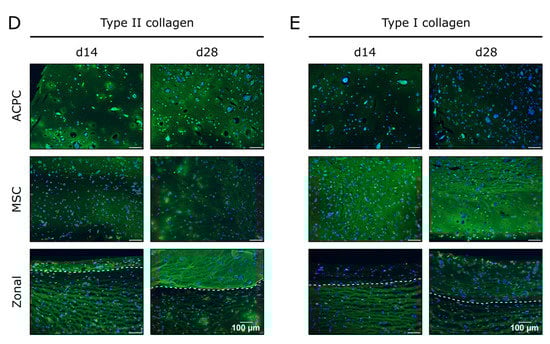 In constructs of all groups, collagen content could be determined, which significantly increased until day 28 (Figure 2A,C). When normalized to the DNA content, it was shown that MSCs produced more collagen than ACPCs (Figure 2B). In immunohistochemical staining of type II collagen, similar intensities for both ACPCs and MSCs were detected (Figure 2D), increasing from day 14 to day 28. In contrast, type I collagen (Figure 2E) was strongly expressed by MSCs, while ACPC constructs showed a distinctly less intense staining at day 14 and day 28. Similar trends were also detected in the zonal constructs, showing similarly intense stainings for type II collagen in both layers at day 28, while at day 14 ACPCs expressed higher levels of type II collagen in co-culture constructs than in monoculture constructs (Figure 2D). For type I collagen, in zonal constructs distinctly stronger staining was detected in the bottom layer with embedded MSCs compared to the ACPC layer. ACPCs showed slightly higher expression of type I collagen in co-culture constructs than in monoculture constructs (Figure 2E). Control stainings of type I and type II collagen at day 1 are shown in Supplementary Figure S4 for comparison. In all the experimental groups, type VI collagen staining (Supplementary Figure S5A) was not spread throughout the whole constructs but was localized in pericellular fashion around the cells, as it is in native articular cartilage, which was observed for all groups.