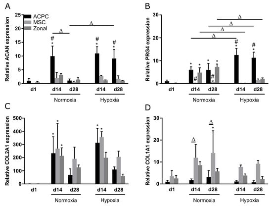 Relative gene expression of the genes ACAN, PRG4, COL2A1, and COL1A1 was investigated at day 1, day 14, and day 28 under normoxia and hypoxia. Overall, similar observations as in biochemical assays and stainings were made; ACPCs showed distinctly higher expression of proteoglycan genes ACAN (Figure 5A) and PRG4 (Figure 5B) than MSCs, while MSCs expressed higher levels of COL1A1 (Figure 5D) than ACPCs. Hypoxia and normoxia levels of chondrogenic marker genes ACAN (Figure 5A) and COL2A1 (Figure 5C) did not differ significantly (with exception of the value of ACAN expression in ACPCs on day 28 under normoxia). COL1A1 levels were decreased under hypoxia in all d14 and d28 constructs (Figure 5D). PRG4 is the gene that encodes lubricin, a typical marker for the superficial zone in cartilage. Under normoxia, PRG4 expression was similar in zonal constructs and in ACPC constructs. Interestingly, under hypoxia, the expression was downregulated in zonal constructs to low levels similar to MSC constructs.