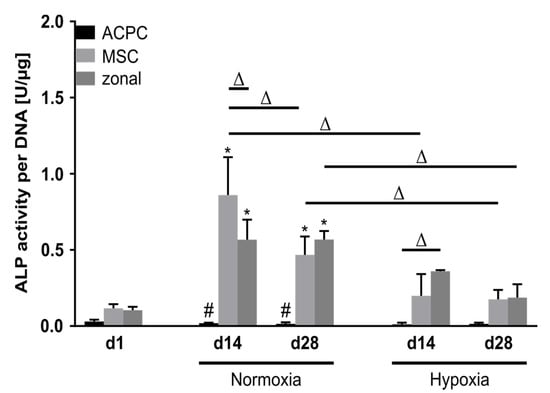 Alkaline phosphatase activity in ACPC, MSC, and zonal constructs. ALP activity in agarose hydrogel constructs, seeded with 20.0 × 106 cells mL−1, after 1, 14, and 28 days of chondrogenic differentiation under normoxic and hypoxic conditions. ACPCs and MSCs were either cultured alone or in zonally layered co-culture constructs. Data are presented as means ± standard deviations (n = 3 biological replicates). Note: (*) indicates statistically significant differences between a d14 or d28 value and the corresponding d1 value of the same group (p < 0.05); (#) indicates statistically significant differences of this group compared to the other two groups that share the same time point and oxygen condition (p < 0.05); (Δ) indicates statistically significant differences between groups, or within a group between time points (p < 0.05).
