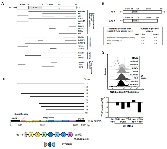 Intracellular YB-1 has a number of known interacting partners (Figure 1A) [2]. However, less is known about extracellular YB-1. In a previous effort to identify novel YB-1 interacting proteins, we performed a yeast-two hybrid (Y2H) screen using a cDNA library generated from a human mesangial cell line. Both full-length YB-1 and a C-terminally truncated ΔYB-1, missing 30 amino acids that includes the dilysine motif required for secretion (K301/K304), were used as bait (Figure 1B) [6]. The functional relevance of this approach has been demonstrated for two other interacting proteins: receptor Notch-3 and splicing factor SRp30c [7,37]. Among the proteins identified (see Figure 1C), progranulin (PGRN) was of particular interest, since it is thought to exert its anti-inflammatory activities by modulating the binding of TNFα to its receptors [38,39]. Therefore, we hypothesized that YB-1 and PGRN might team up to modulate TNFα activity.