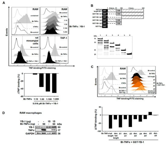 YB-1 inhibits TNFα binding to TNF receptors (TNFRs). (A) RAW 264.7 macrophages were pre-incubated with increasing doses of recombinant Flag-YB-1 and stained for Bt-TNFα-binding. Binding of Bt-TNFα was analyzed with flow cytometry. (B) GST-tagged YB-1 deletion mutants were used to identify the minimal sequence required for interaction. Western Blot analysis of purified GST constructs: lane 1—GST-full length YB-1, lane 2—GST-YB-1 Δ1, lane 3—GST-YB-1 Δ3, lane 4—GST-YB-1 Δ4, lane 5—GST-YB-1 Δ5 and lane 6—GST-tag alone. (C) RAW 264.7 cells were pre-incubated with GST-YB-1 deletion mutants, stained for the binding of Bt-TNFα, and analyzed with flow cytometry. (D) RAW 264.7 macrophages were incubated with 15 µg recombinant Flag-YB-1 and/or 50 ng/mL Bt-TNFα, washed, lysed and bound ligand detected by Western blotting. GAPDH is included as the loading control.