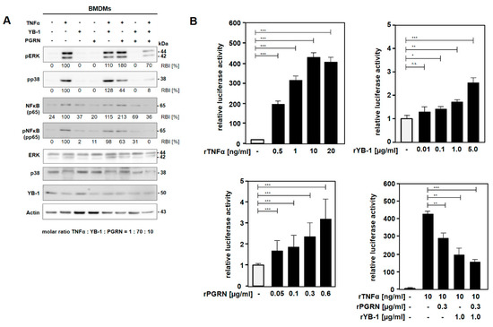 TNFα-mediated signaling is influenced by YB-1 and PGRN. (A) Bone marrow-derived macrophages (BMDMs) were stimulated with recombinant mTNF (625 pM), PGRN (5 nM), and YB-1 (28 nM) for 10 min. After cell lysis, proteins were blotted and analyzed for the expression of pERK, pp38, NF-κB, pNF-κB, YB-1, and actin as the loading control. Band intensities were quantified and normalized to actin. Values are expressed as relative band intensity (RBI), with the level of activation for TNFα-stimulation set to 100%. (B) The pGL4.32 luciferase reporter construct harboring an NF-κB responsive element was introduced into HEKLentiX cells by calcium phosphate precipitation. Recombinant hTNFα was added at the indicated concentrations following the transfer of cells into serum-free starving medium. Stimulation with recombinant proteins was performed as indicated for 5 h, and luciferase activity quantified according the manufacturer’s instructions. * p = 0.05, ** p = 0.01, *** p = 0.001.