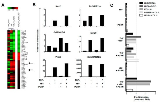 To gain a comprehensive overview of the changes going on within the cells, we extracted RNA and analyzed the gene expression profiles. The comparison of TNF-stimulated macrophages with unstimulated cells identified more than 1124 differentially expressed genes (cut off >1.5-fold), including 26 known TNF targets. Comparison of the triple stimulation with TNF alone identified a unique subset of 46 differentially expressed genes (Figure 4A). To validate these findings, we again purified RNA from stimulated cells, transcribed it into cDNA, and performed TaqMan expression analysis for six candidate genes (Nos2, Ptgs2, Ccl2/MCP-1, Ccl3/MIP1α, Ccl5/RANTES, and Mmp9). As seen in Figure 4B, we confirmed the results of two candidates selected from the gene array, namely Nos2 and Ptgs2, which both showed a further upregulation upon triple stimulation in comparison to TNF alone. A similar trend was seen for matrix metallopeptidase 9 (Mmp9), which is a known TNFR as well as YB-1 target gene [41,42]. In the multiplex assay, we observed an induction for both Ccl3/MIP1α and Ccl5/RANTES. The effect of YB-1/PGRN co-stimulation was less prominent. This is most likely because RNA is subject to additional regulation within the cell at the level of translation. Here, YB-1 is known to exert much of its activity [43]. YB-1 is able to both enhance and suppress the translation of chemokine mRNAs, such as Ccl5/RANTES, depending upon the cellular circumstances [44,45,46,47,48].