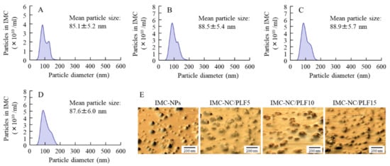 Next, we evaluated the effect of enhanced viscosity on drug diffusion and release in the IMC-NC-incorporating ISG (Figure 4). IMC in the IMC-NPs shifted to the reservoir side from the donor side at 10 °C and 37 °C, while IMC particle size remained in the nanosize range in the reservoir chamber. Although the behavior of IMC release in the IMC-NC-incorporating ISG with 5% and 10% PLF-127 was similar to that in IMC-NPs, the time needed for IMC transfer to the reservoir side from the donor side was increased in the IMC-NC-incorporating ISG with 15% PLF-127 (IMC-NC/PLF15, Figure 4A). Otherwise, no significant difference was observed in the release of IMC between IMC-NPs and IMC-NC/PLF5 at 37 °C. However, the diffusion of IMC-NCs decreased upon the addition of 10% and 15% PLF-127, while the release of IMC-NCs from gelled IMC-NC/PLF10 and IMC-NC/PLF15 was significantly attenuated compared to that from IMC-NPs (Figure 4B). On the other hand, IMC particles released from the IMC-NC-incorporating ISG remained in the nanosize range in the reservoir chamber at both 10 °C and 37 °C (Figure 4C,D).