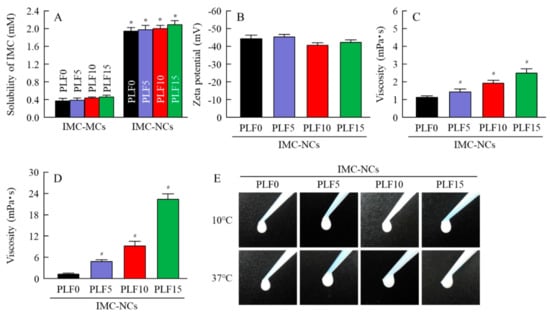 Changes in solubility, zeta potential, and viscosity of each ophthalmic IMC-NC formulation. (A) Solubility of IMC in IMC microcrystals (IMC-MCs) and IMC-NCs with Pluronic F-127 (PLF-127). (B) Zeta potential of IMC in IMC-NPs, IMC-NC/PLF5, IMC-NC/PLF10, and IMC-NC/PLF15. (C,D) Viscosity of IMC-NPs, IMC-NC/PLF5, IMC-NC/PLF10, and IMC-NC/PLF15 at (C) 10 °C and (D) 37 °C. (E) Image of IMC-NPs, IMC-NC/PLF5, IMC-NC/PLF10, and IMC-NC/PLF15 at 10 °C and 37 °C. Compositions of each ophthalmic IMC-NC formulation shown in Table 1; n = 7–8; * p < 0.05 vs. IMC-MC for each category, # p < 0.05 vs. PLF0 (IMC-NPs). The addition of PLF-127 did not affect IMC solubility and zeta potential in IMC-NC-incorporating ISG. The viscosity of ophthalmic PLF-127-based IMC-NC-incorporating ISG was higher at 37 °C than at 10 °C. In particular, the gelation of IMC-NC/PLF10 and IMC-NC/PLF15 was promoted at 37 °C, with viscosity of approximately 9.2 and 22.3 mPa∙s, respectively.
